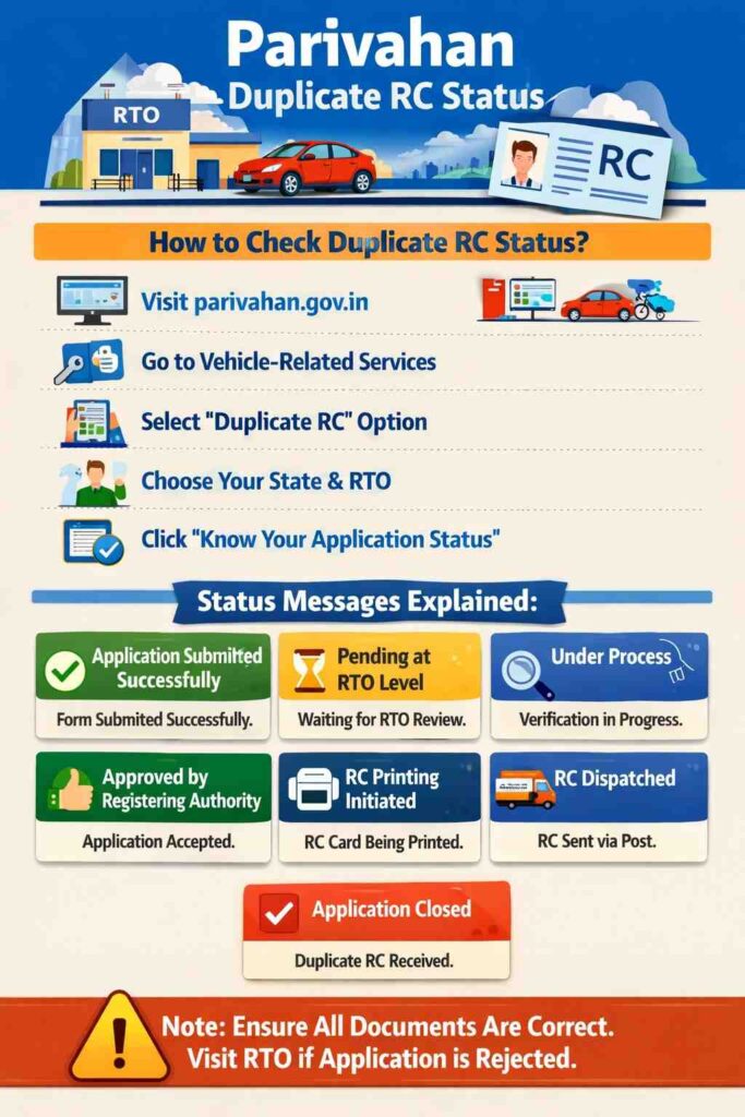 The status for the duplicate RC can be checked through the Privahan Sewa portal, for which you must have your application number. By checking the status, you can find out what is happening with your application for the duplicate registration certificate.