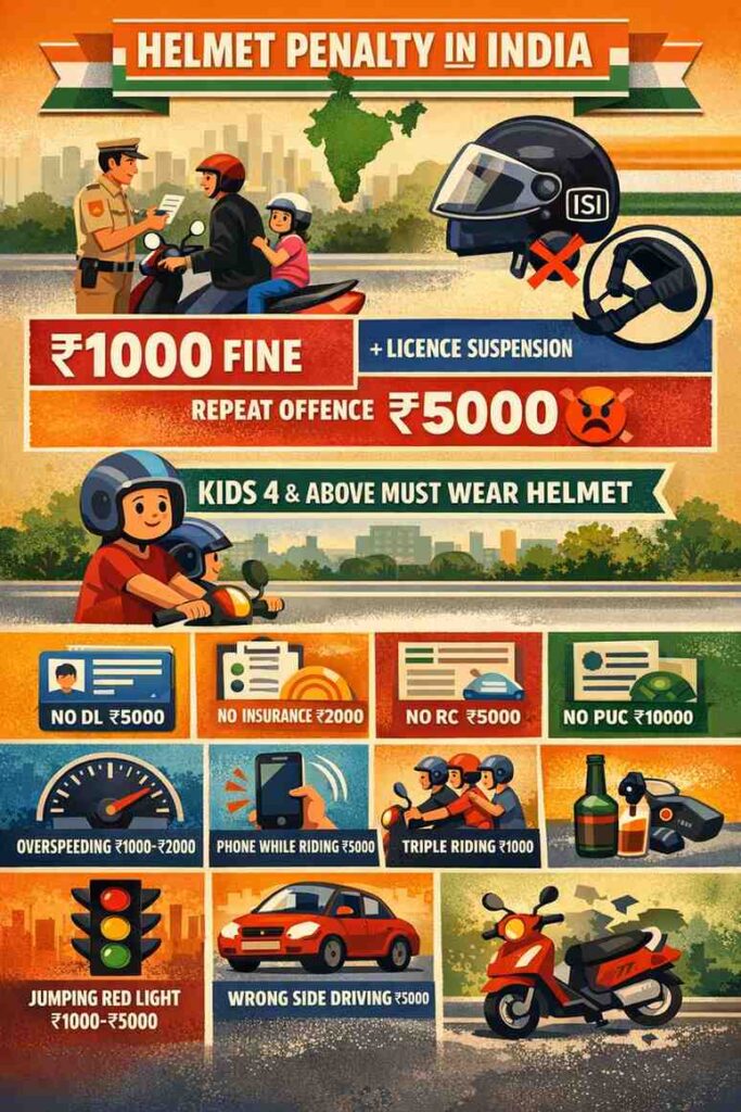 Across all states and UTs of India, the penalty for driving without a helmet is ₹1,000. In some states, to strictly enforce this rule, the rider’s driving licence may also be suspended for a period of up to 3 months. In the event of a repeat violation, particularly if a helmet is not worn and it is being driven rashly, the penalty amount can increase to ₹5,000.