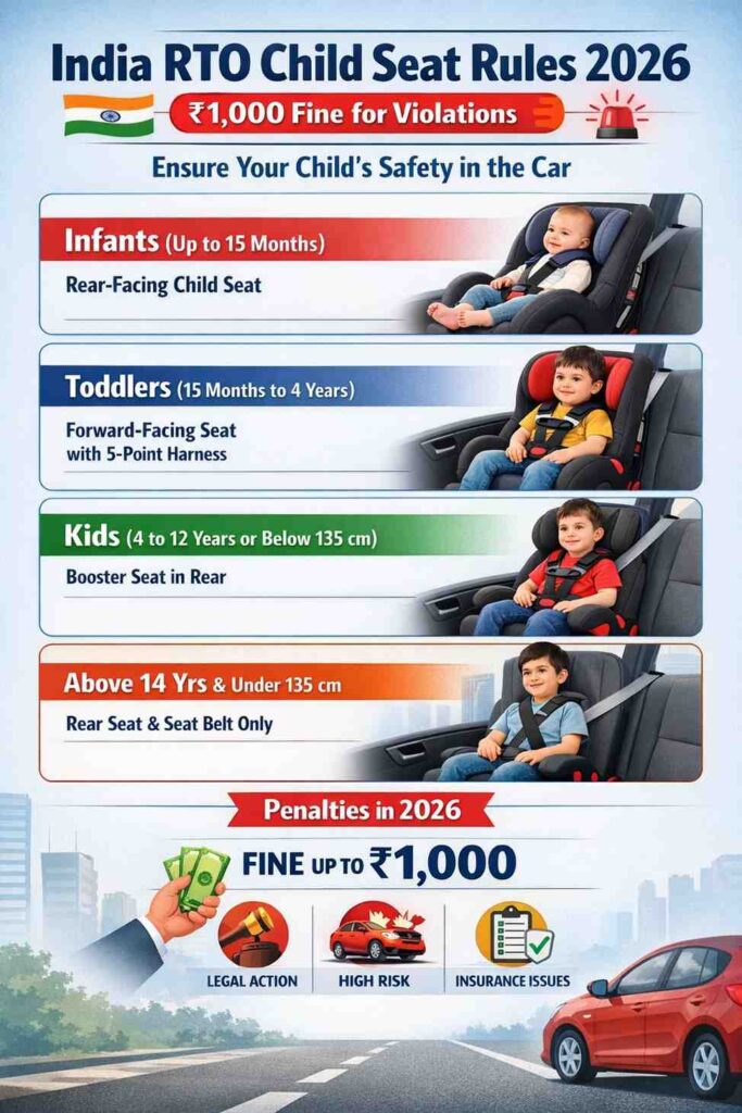 In 2026, if you violate RTO rules related to child seats, you could be fined up to 1,000 rupees and face other consequences too. And if you have an infant traveling with you and there’s no child restraint system, the penalty could be substantial.